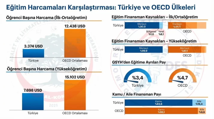 OECD 2025 raporuna göre, ilkokuldan ortaöğretime kadar olan kademelerde öğrenci başına yapılan kamu harcaması Türkiye’de 3.374 dolar düzeyinde. OECD ülkeleri ortalaması ise 12.438 dolar. Bu tablo, OECD ülkelerinde bir öğrenciye Türkiye’ye kıyasla yaklaşık 3 ila 4 kat daha fazla yatırım yapıldığını gösteriyor.